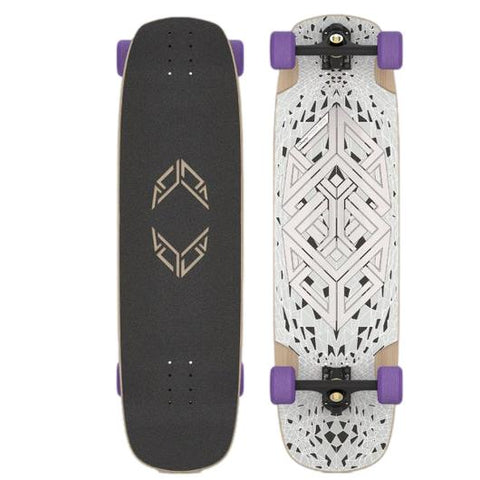 The Tesseract II is your portal to high-performance freestyle and freeride. Its micro-drop platform locks you in for an immersive connection, while symmetrical double kicks defy gravity, opening up a universe of possibilities. Built with six plies of long-grain maple and triaxial fiberglass, it's engineered for perfect stellar stiffness and explosive pop. Laser-cut 50-grit griptape and machined wheel wells keep you grounded, while the photochromic graphic hints at new dimensions in your skateboard progression.